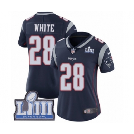 >Women's Nike New England Patriots #28 James White Navy Blue Team Color Vapor Untouchable Limited Player Super Bowl LIII Bound NFL Jersey