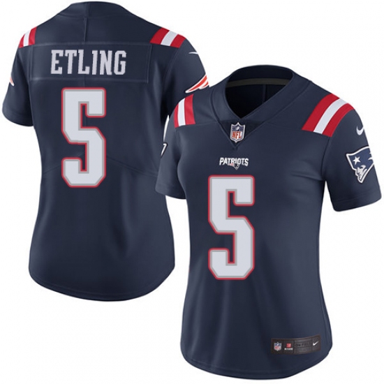 >Women's Nike New England Patriots #5 Danny Etling Limited Navy Blue Rush Vapor Untouchable NFL Jersey