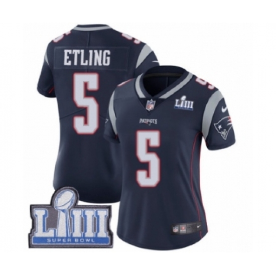 >Women's Nike New England Patriots #5 Danny Etling Navy Blue Team Color Vapor Untouchable Limited Player Super Bowl LIII Bound NFL Jersey