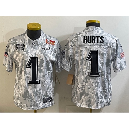 Women's Philadelphia Eagles #1 Jalen Hurts 2025 Super Bowl LIX F.U.S.E. Arctic Camo Salute to Service Limited Football Stitched Jersey(Run Small)
