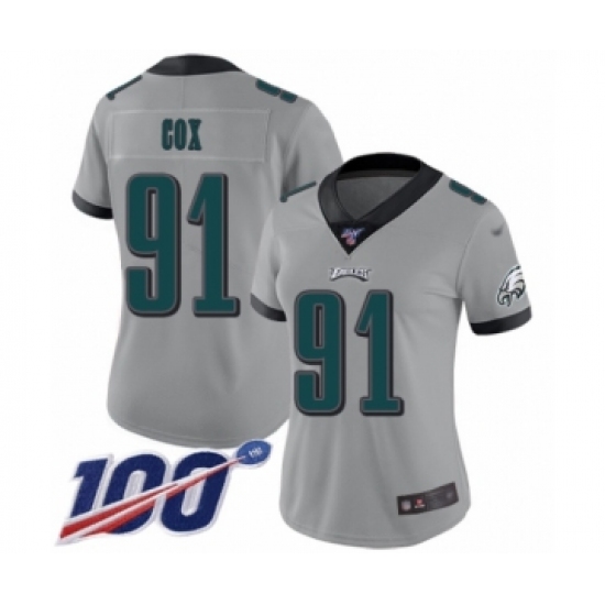>Women's Philadelphia Eagles #91 Fletcher Cox Limited Silver Inverted Legend 100th Season Football Jersey