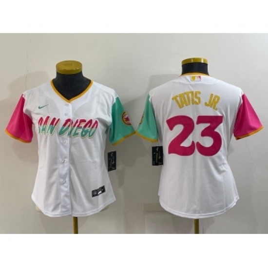 >Women's San Diego Padres #23 Fernando Tatis Jr White 2022 City Connect Cool Base Stitched Jersey