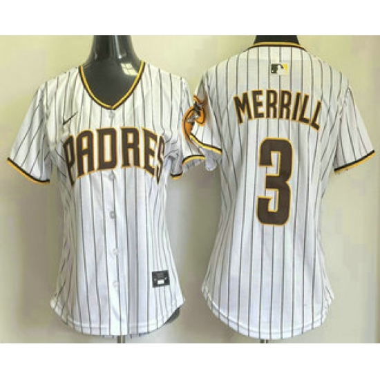>Women's San Diego Padres #3 Jackson Merrill White Pinstripe Limited Stitched Jersey