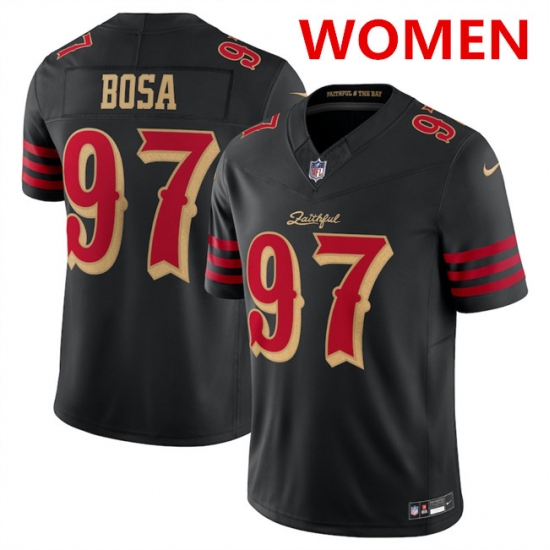 >Women's San Francisco 49ers #97 Nick Bosa Black 2025 F.U.S.E. “Rivalries” Vapor Limited Stitched Football Jersey(Run Small)