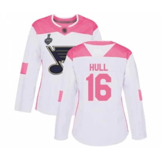 Women's St. Louis Blues #16 Brett Hull Authentic White Pink Fashion 2019 Stanley Cup Final Bound Hockey Jersey
