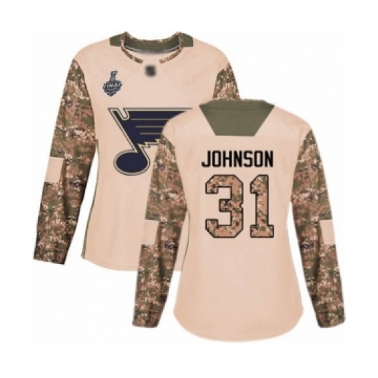 >Women's St. Louis Blues #31 Chad Johnson Authentic Camo Veterans Day Practice 2019 Stanley Cup Final Bound Hockey Jersey