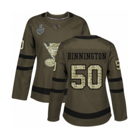 Women's St. Louis Blues #50 Jordan Binnington Authentic Green Salute to Service 2019 Stanley Cup Final Bound Hockey Jersey