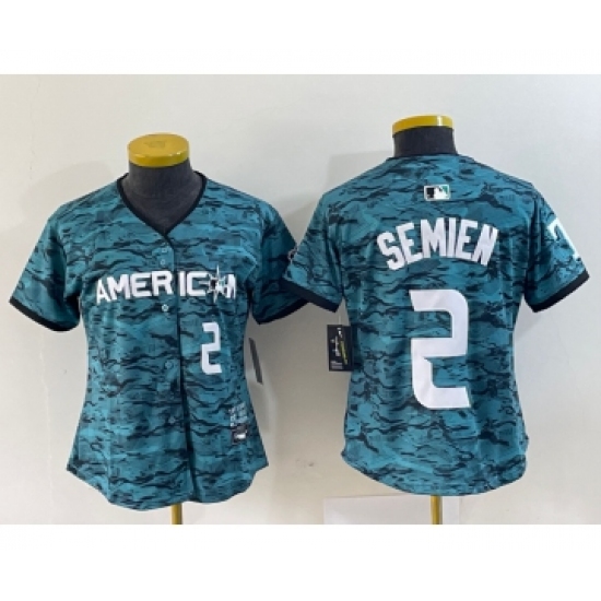 >Women's Texas Rangers #2 Marcus Semien Number Teal 2023 All Star Stitched Baseball Jersey