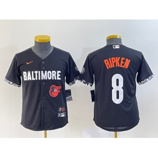 >Youth Baltimore Orioles #8 Cal Ripken Jr Black 2023 City Connect Cool Base Stitched Jersey