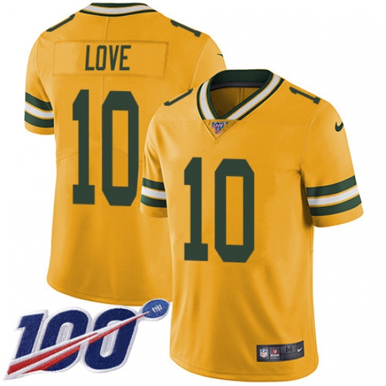 >Youth Green Bay Packers #10 Jordan Love Yellow Stitched NFL Limited Rush 100th Season Jersey