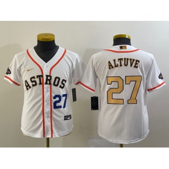 >Youth Houston Astros #27 Jose Altuve Number 2023 White Gold World Serise Champions Cool Base Stitched Jersey1