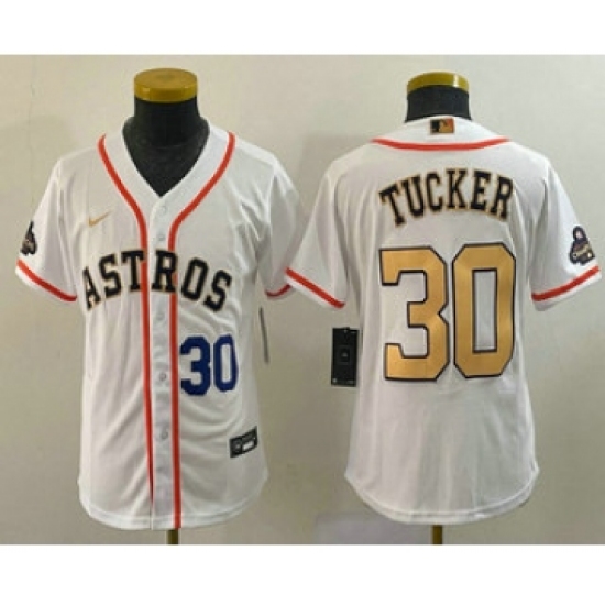 >Youth Houston Astros #30 Kyle Tucker Number 2023 White Gold World Serise Champions Cool Base Stitched Jersey1