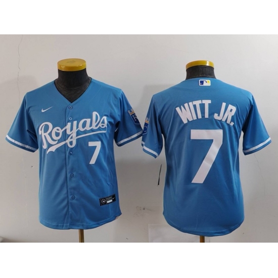 >Youth Kansas City Royals #7 Bobby Witt Jr Number Light Blue Cool Base Stitched Jersey
