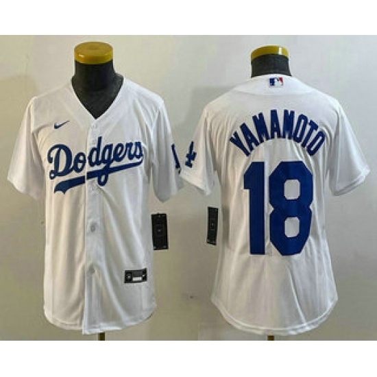 >Youth Los Angeles Dodgers #18 Yoshinobu Yamamoto White Stitched Cool Base Nike Jersey