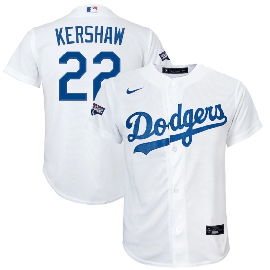 Youth Los Angeles Dodgers #22 Clayton Kershaw Nike White 2020 World Series Champions Home Replica Player Jersey