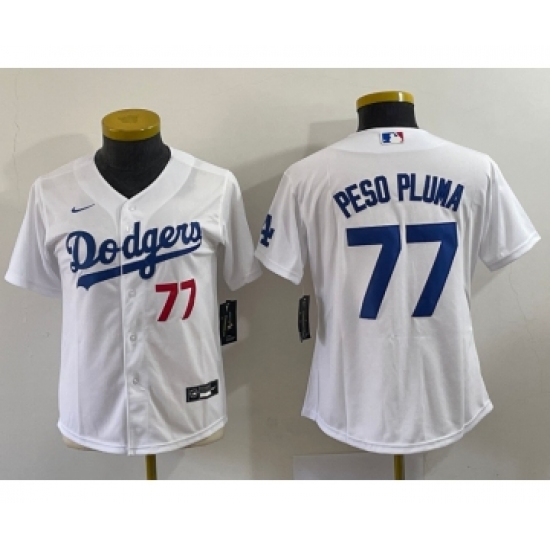 Youth Los Angeles Dodgers #77 Peso Pluma Number White Stitched Cool Base Nike Jersey