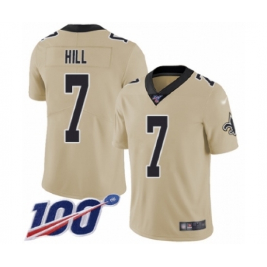 >Youth New Orleans Saints #7 Taysom Hill Limited Gold Inverted Legend 100th Season Football Jersey