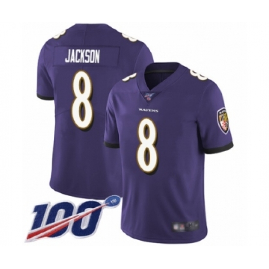 >Youth Nike Baltimore Ravens #8 Lamar Jackson Purple Team Color Vapor Untouchable Limited Player 100th Season NFL Jersey