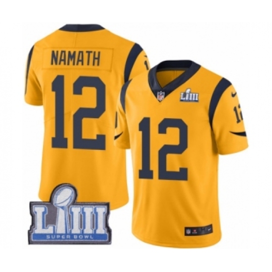 >Youth Nike Los Angeles Rams #12 Joe Namath Limited Gold Rush Vapor Untouchable Super Bowl LIII Bound NFL Jersey
