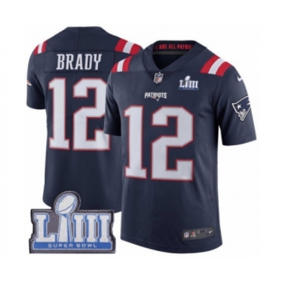 >Youth Nike New England Patriots #12 Tom Brady Limited Navy Blue Rush Vapor Untouchable Super Bowl LIII Bound NFL Jersey