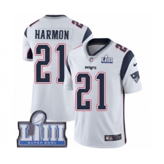 >Youth Nike New England Patriots #21 Duron Harmon White Vapor Untouchable Limited Player Super Bowl LIII Bound NFL Jersey