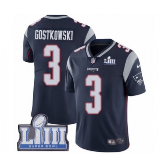 >Youth Nike New England Patriots #3 Stephen Gostkowski Navy Blue Team Color Vapor Untouchable Limited Player Super Bowl LIII Bound NFL Jersey