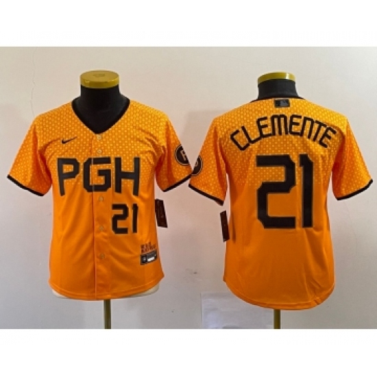 Youth Nike Pittsburgh Pirates #21 Roberto Clemente Number Yellow 2023 City Connect Stitched Jersey