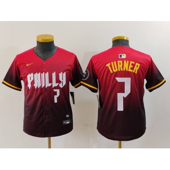 >Youth Philadelphia Phillies #7 Trea Turner Number Red 2024 City Connect Limited Jersey