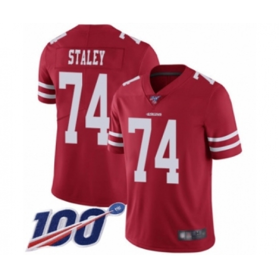 >Youth San Francisco 49ers #74 Joe Staley Red Team Color Vapor Untouchable Limited Player 100th Season Football Jersey
