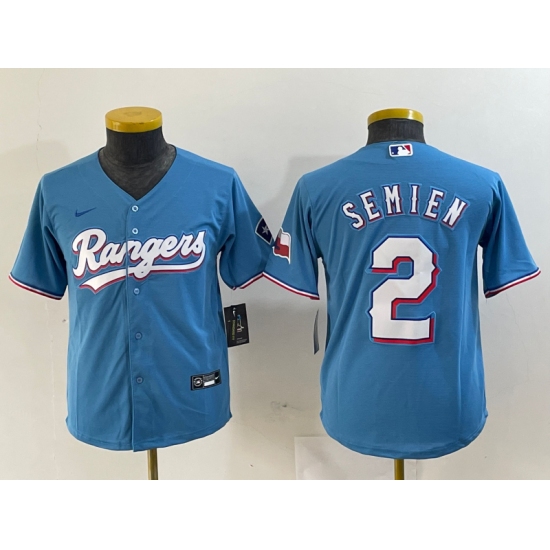 Youth Texas Rangers #2 Marcus Semien Light Blue Team Logo Cool Base Jersey